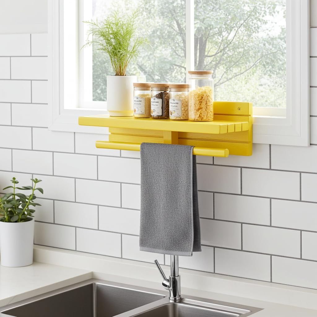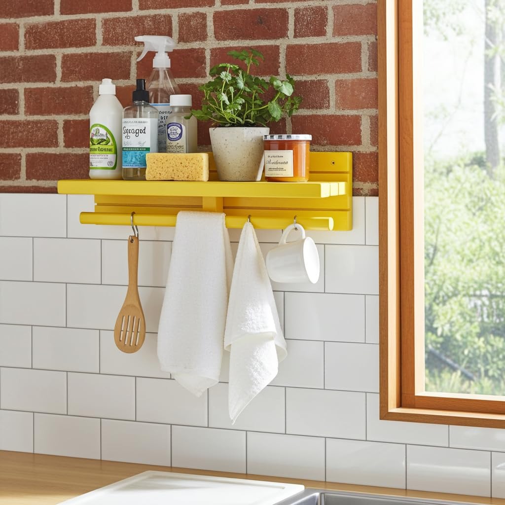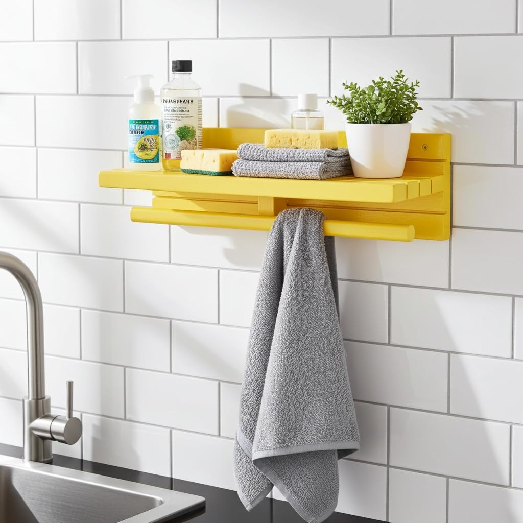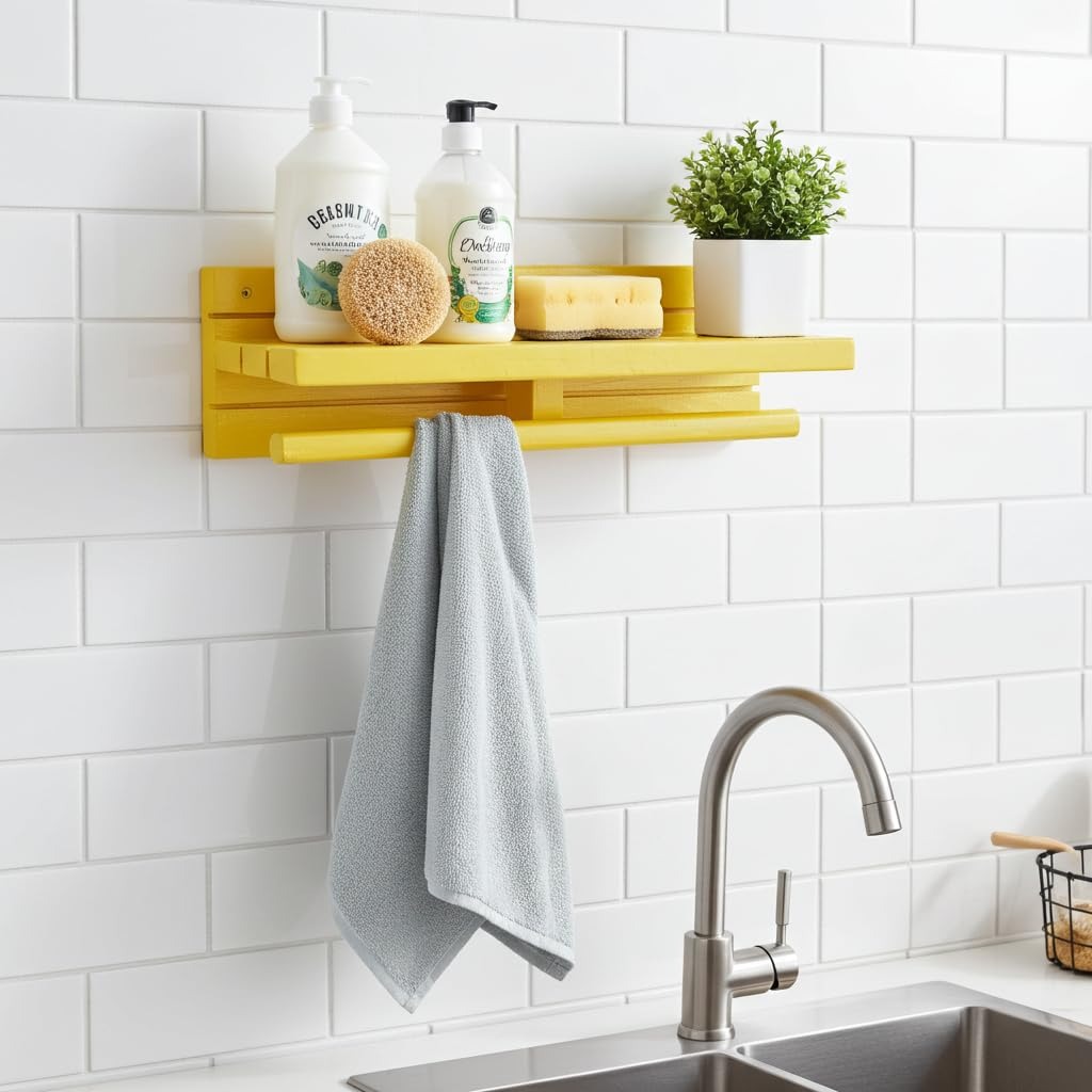 Crafted from durable wood with a smooth painted yellow finish, this wall mounted wooden shelf with towel rod adds a fresh modern touch to your kitchen while maximising vertical wall space. Perfect for small kitchens, apartments, and utility areas, it frees up valuable counter space and keeps essentials within easy reach.