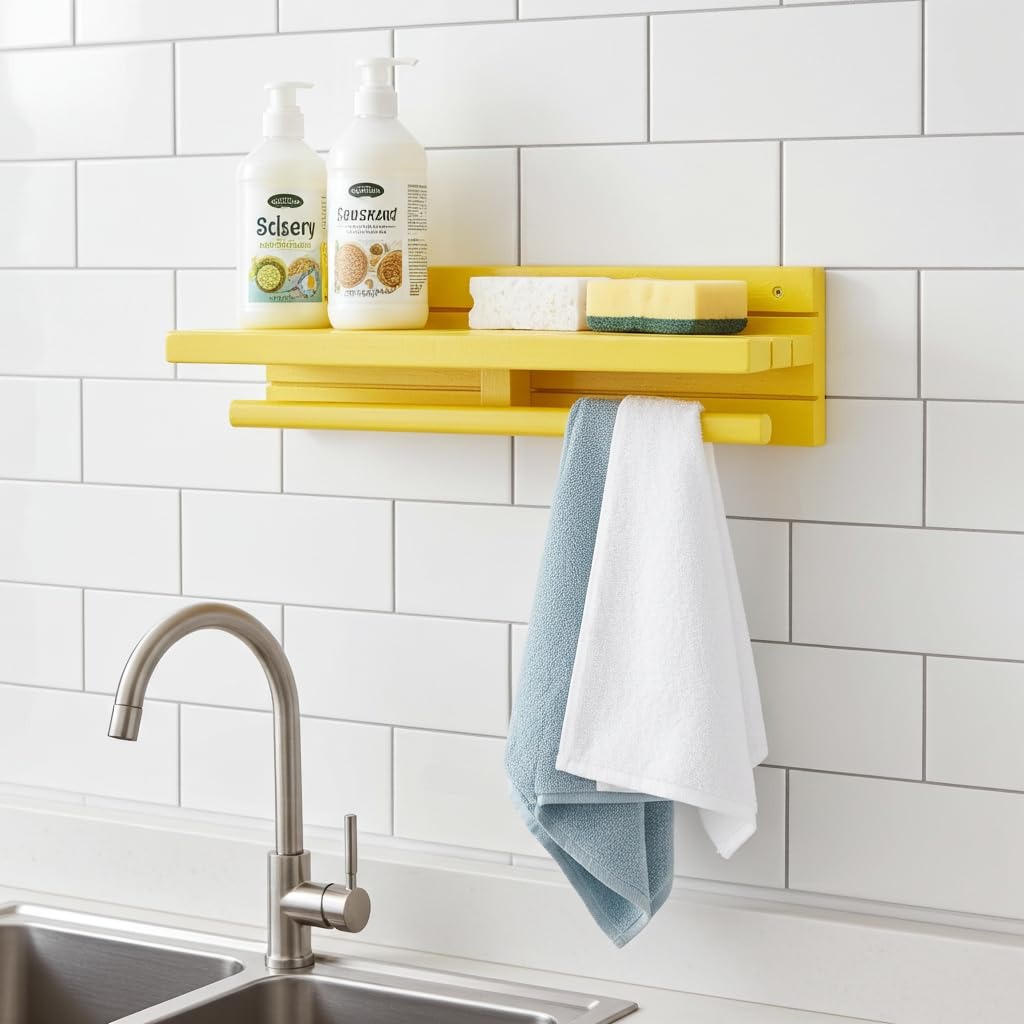Wall Mounted Wooden Shelf with Towel Rod designed to keep your sink area neat, organised, and clutter-free. This compact wall mounted wooden shelf offers a top platform to hold dishwasher liquid, sponges, scrubbers, and small jars, while the integrated bottom rod allows wet cloths and towels to hang for quick drying.